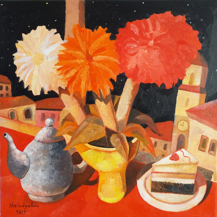 Stretched on wooden frame. Ready to hang. World-wide shipping after prepayment.