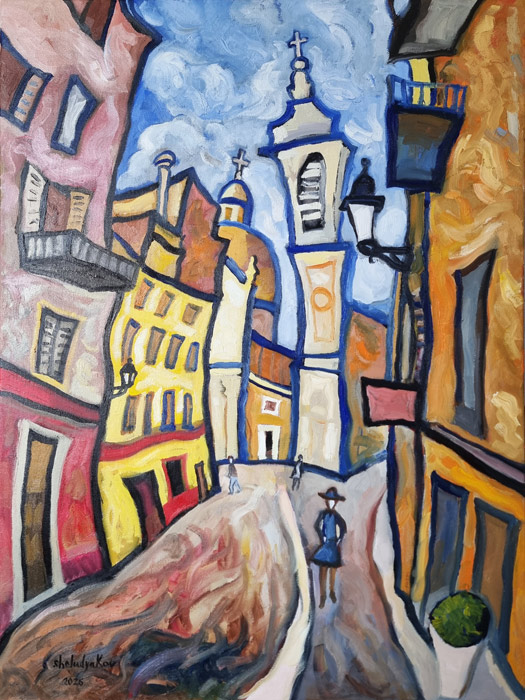 Stretched on wooden frame. Ready to hang. World-wide shipping after prepayment.