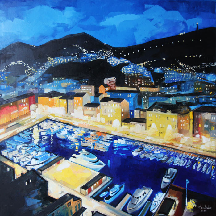 Stretched on wooden frame. Ready to hang. World-wide shipping after prepayment.