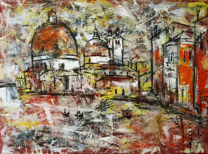 Stretched on wooden frame. Ready to hang. World-wide shipping after prepayment.