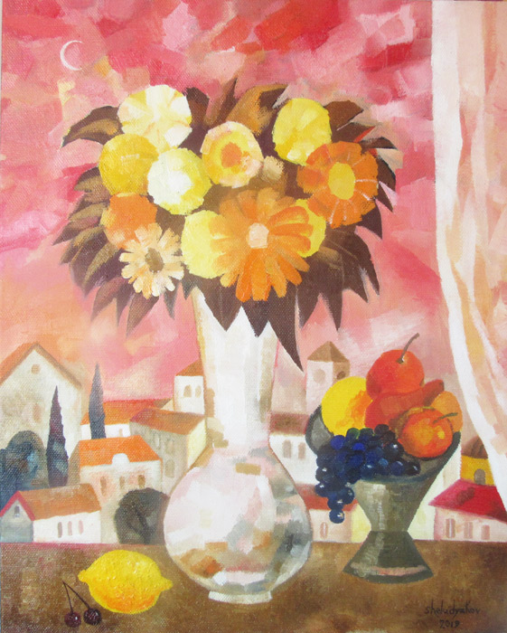 Stretched on wooden frame. Ready to hang. World-wide shipping after prepayment.