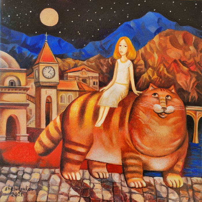 Stretched on wooden frame. Ready to hang. World-wide shipping after prepayment.