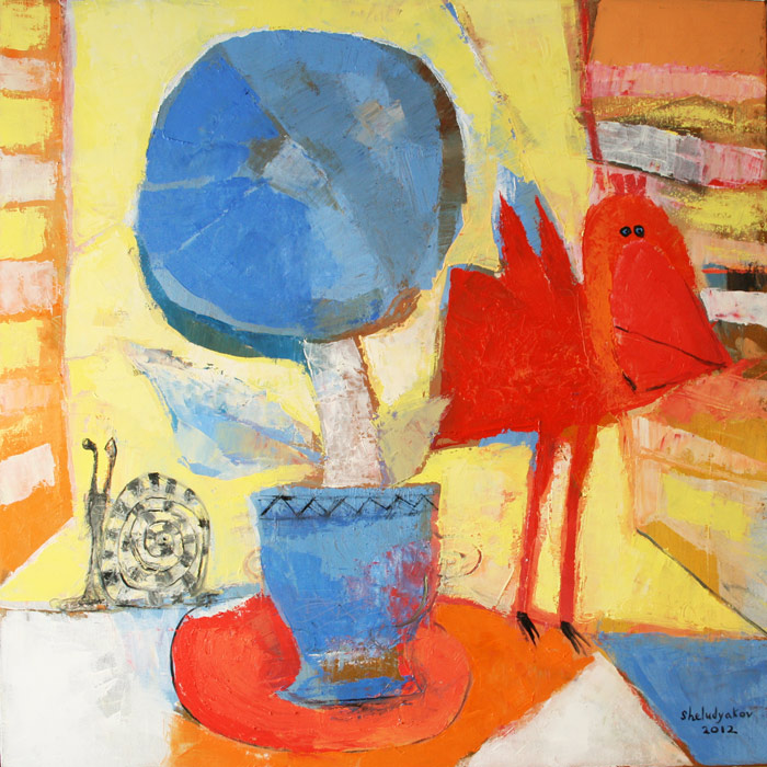 Stretched on wooden frame. Ready to hang. World-wide shipping after prepayment.