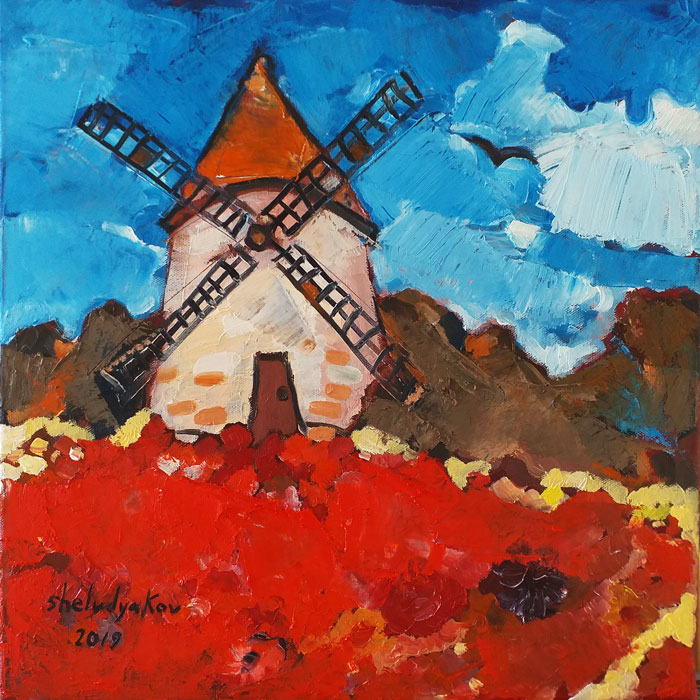 "Mill and red flowers"